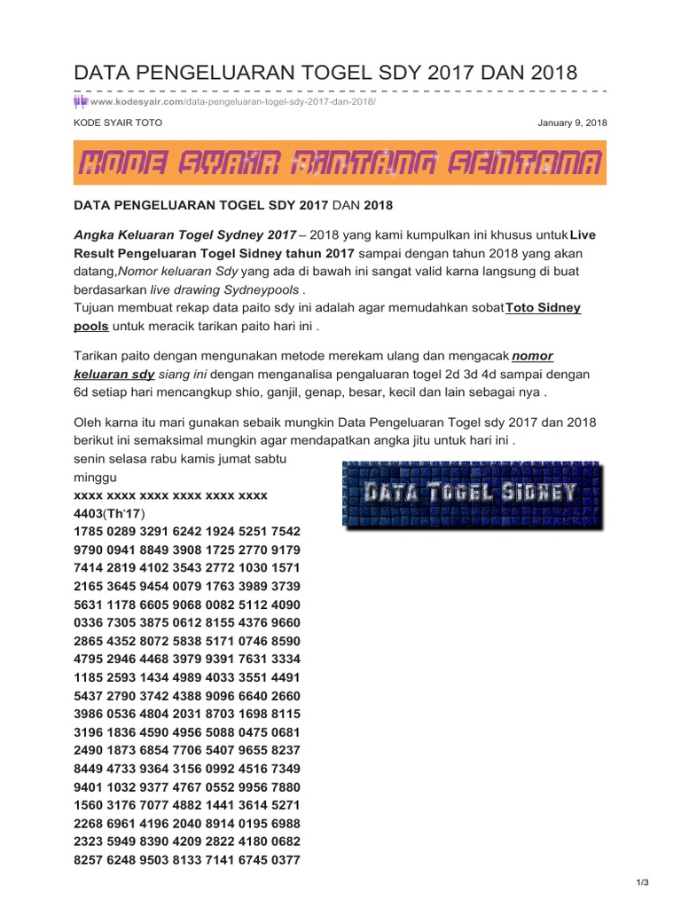 - Kodesyair Com Data Pengeluaran Togel Sdy 2017 Dan 2018 , Sydney Pools Live Result Angka 6D Tepercaya.